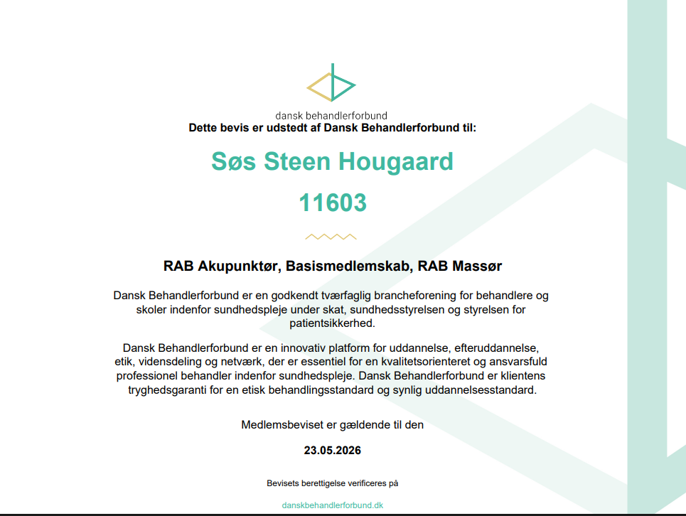 En RAB-registreret akupunktør lever op til bestemte krav om uddannelseslængde, efteruddannelse og etik, hvilket giver dig som patient en ekstra sikkerhed. Spørg altid ind til, hvor og hvor længe behandleren er uddannet, og om uddannelsen omfatter anatomi, fysiologi og sygdomslære. En seriøs akupunktør vil gerne fortælle åbent om sin baggrund og sine kompetencer.
